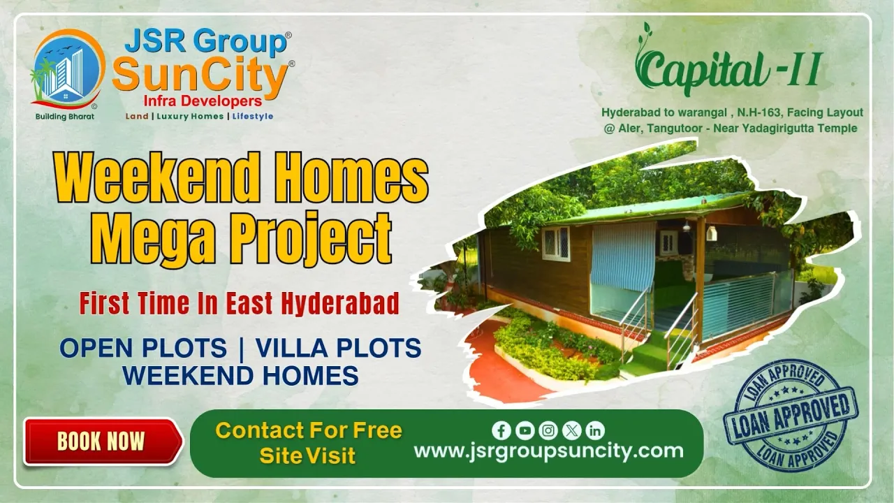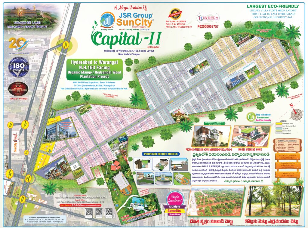 Welcome to JSR Group Suncity Venture Capital-2, a thoughtfully planned community nestled along the Warangal Highway, just minutes from the divine Yadagirigutta — the Telangana Tirupati. Here, you’ll discover the perfect blend of spiritual serenity, fresh air, and lush green spaces designed to help you live a peaceful and fulfilling life.